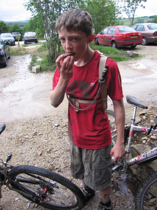 This morning Michael and I did the planned ride at Llandegla and it was all going really well until his front wheel washed out in a large puddle and he landed a good 6 metres further down the trail. Severe cuts and abrasions to his elbow, both knees, chest and hip were the reulting injuries. A spectacular amount of mud on his clothes completed the ensemble. He’s ok. “It’s all part of it”, I explained to him. It’s not like he lost any teeth or broke his bike or owt. He was bloody fast today though. On one downhill section of the black run I had to ride pretty fast once I realised he was bearing down on me through a tight berm. He’s climbing well too. It’s in the blood, clearly 😉