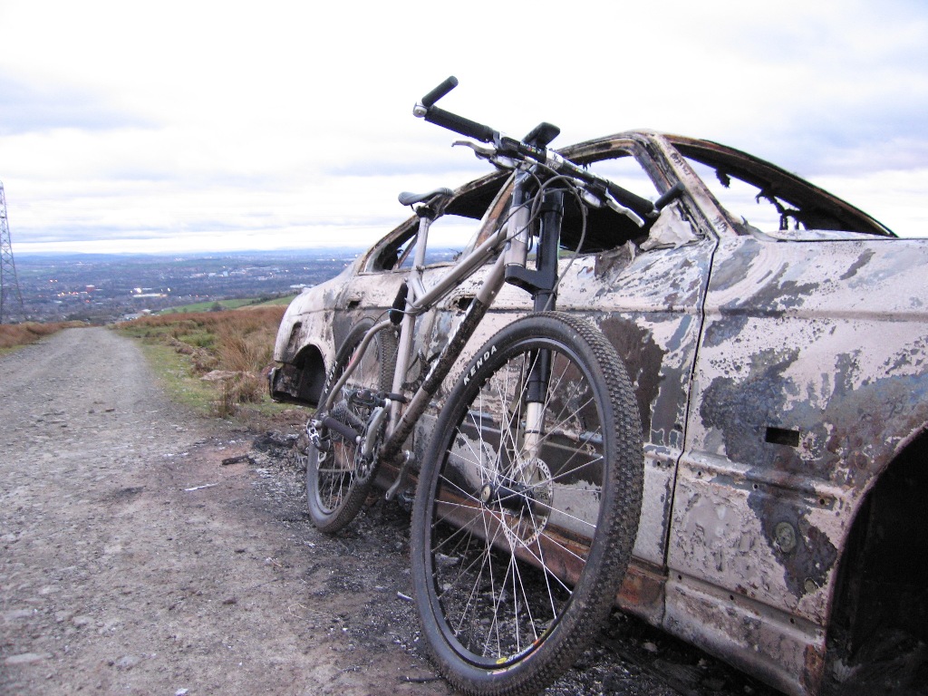 The route was a familiar one, basically riding northeast towards Rochdale, up through the council estate and then climb up RMR, once at the quarry just past the summit, turn around and ride back.I rode up faster than I have done for a bit, no doubt partly due to the light weight bike I was riding and the nippy Small Block 8 tyres (which are good on tarmac as well as dirt). Coming back down the moor convinced me that the fork is now working as it should too, following several days of on-and-off fettling and playing with air pressures. On the way up, I stopped to survey the damage to some poor sod’s BMW….
