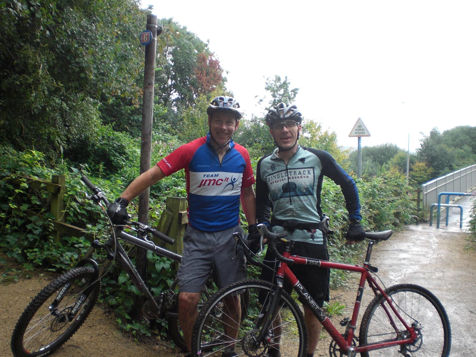 Gaz came over for a ride this morning. He’s in the UK for a week’s break from the hell that is sunny and hot Vancouver so took the opportunity to borrow one of my bikes and ride the buff trails of north Manchester. Oh hang on….that’s not right is it. It’s as muddy as I’ve ever seen it around here at the moment, no doubt the whole of the UK is like this. It’s been raining for as long as I can remember now and I seem to be wearing out brake pads at an alarming rate, in fact I’ve just been on Ebay buying some more…Avids for the cross bike this time. Perhaps I can get a bulk discount from someone. Anyway, it was fun and it’s good to catch up with mates you’ve not seen for ages. Mike came with us and characteristically crashed, this time binning it on some tarmac and taking the skin off his elbow.
