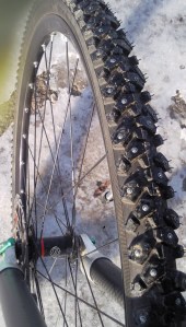 After the disappointing performance of the Schwalbe ice tyres (that were sent back for being crap), I was hoping that the Continental Nordic Spike tyres would be much better, or at least not fall apart, roll off the rim or be so bent that it actually afffected the handling of the bike. I’m happy to say that they’re great.
