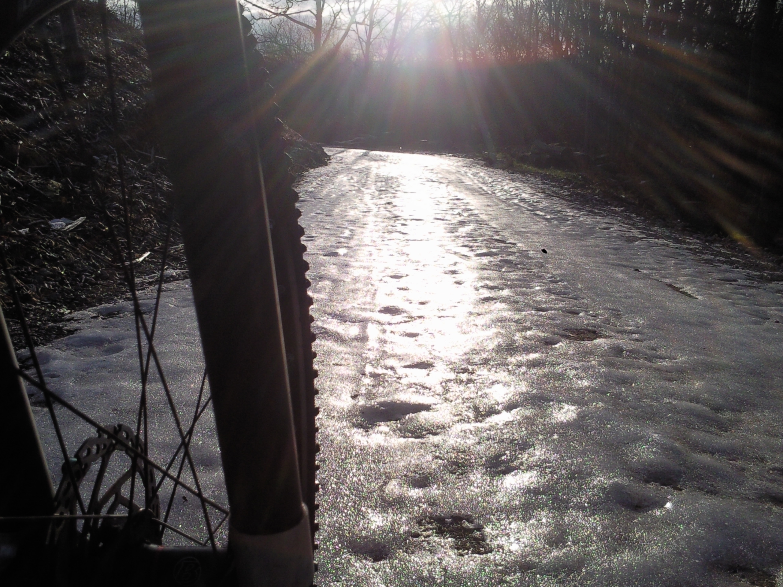 This is getting easier. I’m not grumpy any more. In fact I’m feeling pretty bloody aweso–WHAM. The previously-grippy fireroad near the start of the course went downhill a bit, allowing a bit of freewheeling, a gel out of the back pocket and a drink…until about 4am when, following a brief shower of rain, it turned into a lethal sheet of ice. I slid along the ground for 30 or so feet, the bike sliding much further than that. Picking myself up off the ground and checking my backside wasn’t now hanging out of a hole in my tights, I carried on and ignored the pain in my upper thigh, elbow and wrist. Be careful. Don’t break something important now.
