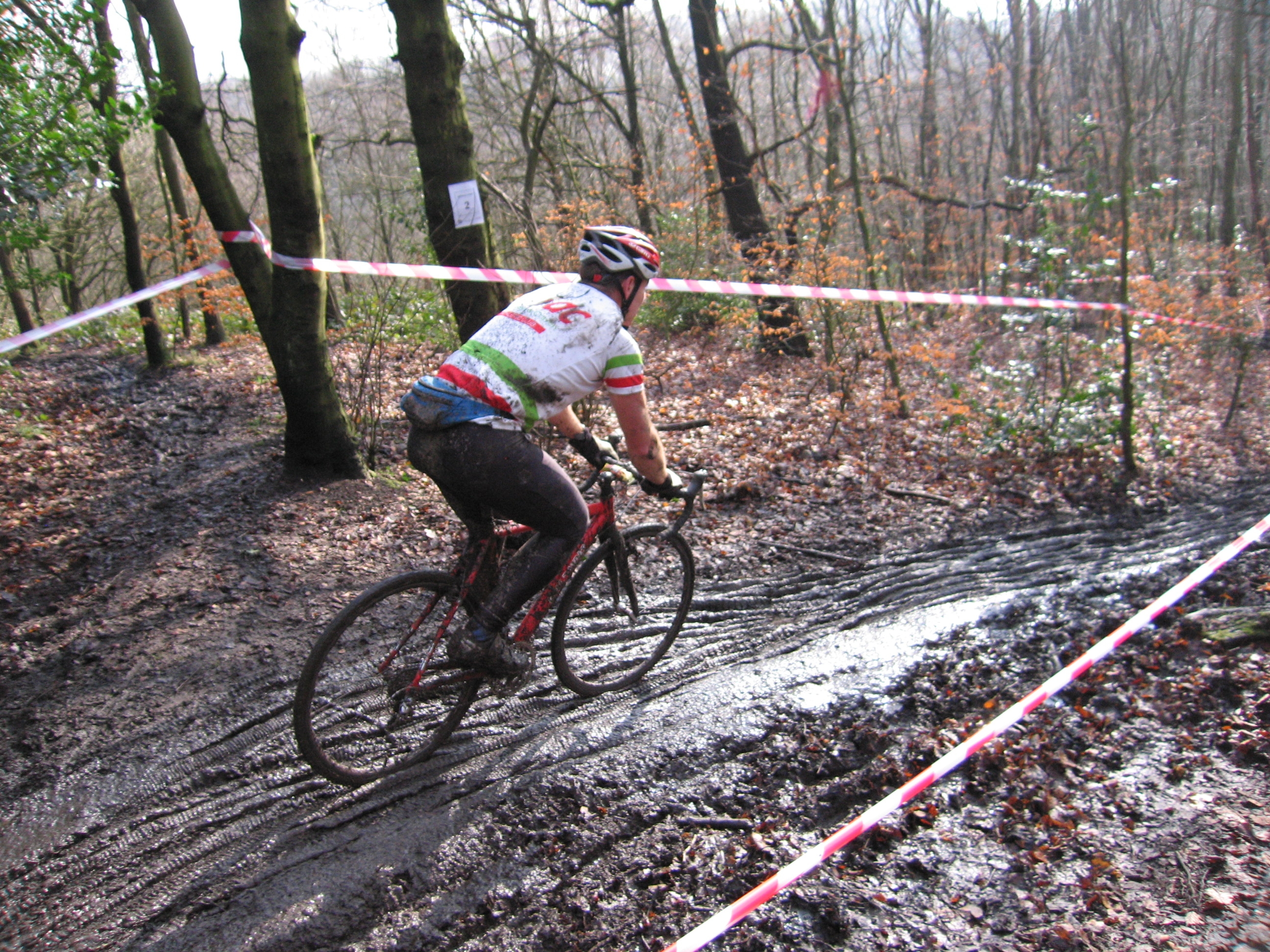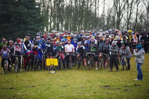 We weren’t as lucky with the conditions this time as we were last February (when the ground was frozen almost solid) – there had been some rain and snow in the last few days and whilst the sun was almost shining today the course was soft and quite muddy in places. Undeterred, almost 200 racers lined up at the start; a good mix again of fast and not-so fast riders on mountain bikes and cyclocross bikes. A failure of the musical airhorns forced some urgent stabbing of the siren function on the PA and they were off, the first lap heading up the tarmac road to the first section of singletrack.