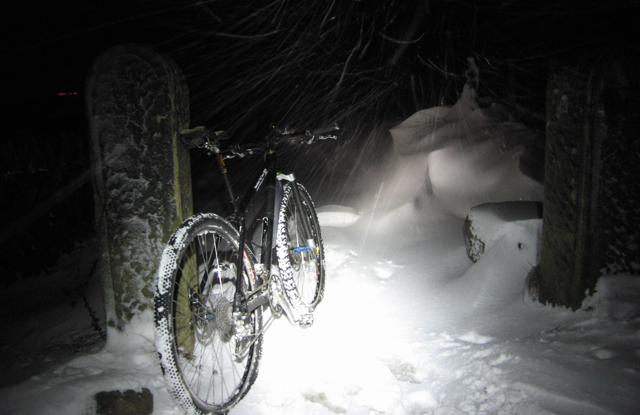 Wednesday’s solo night ride started well, I was confident that my 3.5 hour loop would be all rideable but as I climbed (the first half of the route is all uphill) the snow got deeper and it started to fall from the sky again. Then the wind picked up. Then I couldn’t see anything as I was in the middle of a blizzard.