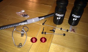 He’s kindly sent me some bars, jockey wheels, a bottle cage, carbon spacers, some wheel skewers (that weigh NOWT) and a couple of bottles and they all look really lovely. Deb thought that someone had posted me an empty box when she collected it from the post office for me.
