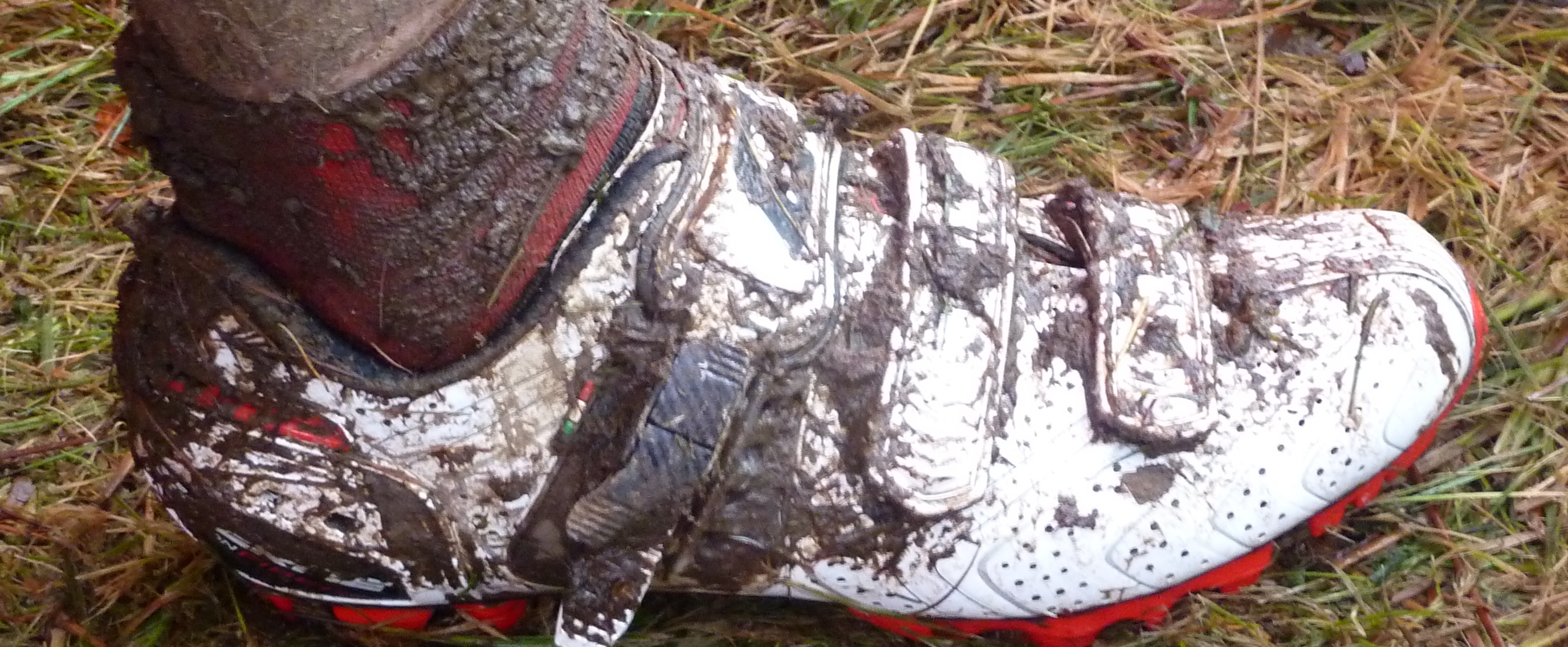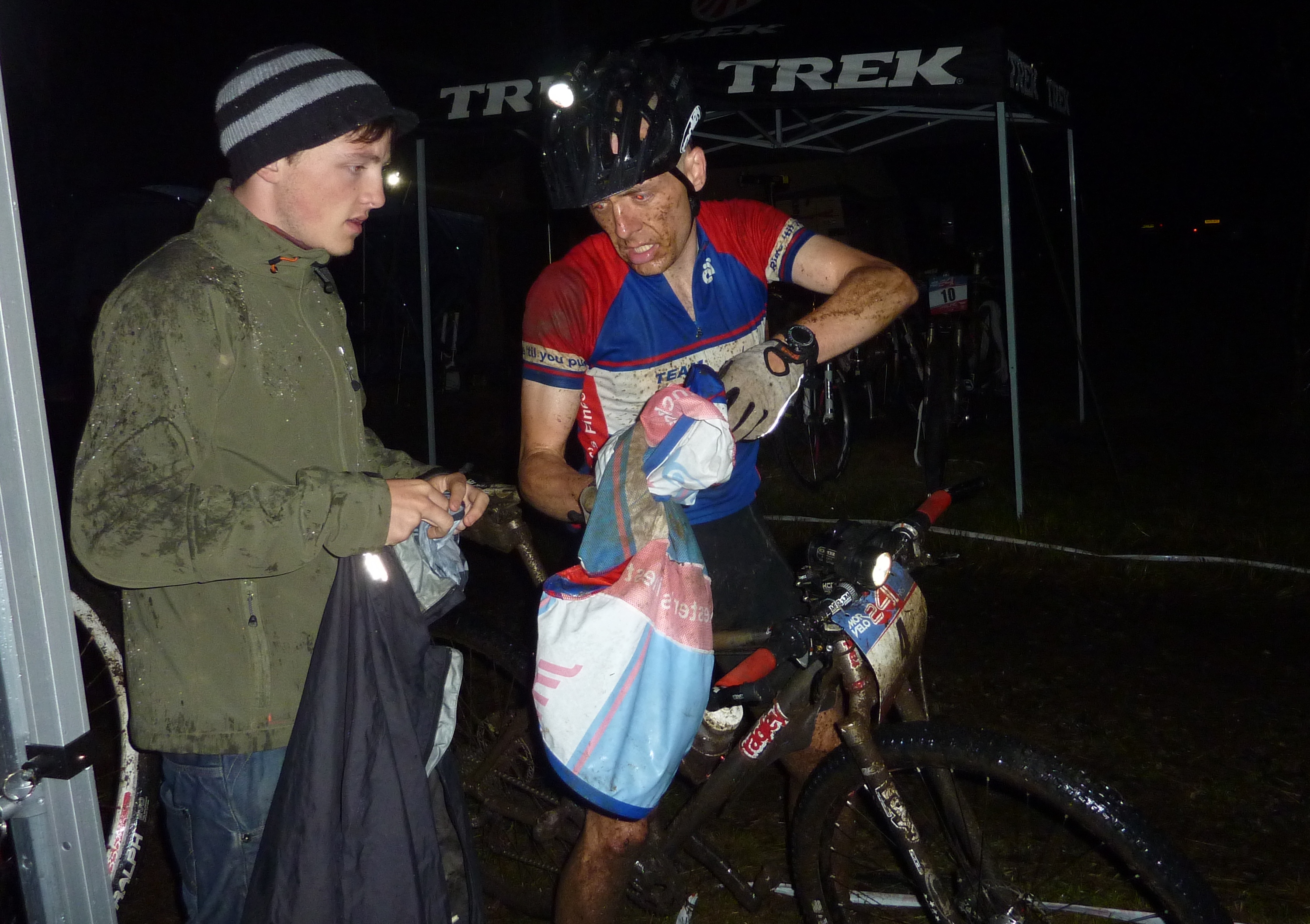 I’m freezing. Really, really freezing. I’ve got a Crimean war-style bandage thing sticking out of a huge hole in the side of my bib shorts (an expensive pair kindly given to me by a sponsor) that’s hopefully keeping the wet mud that’s flying everywhere out of a painful wound on my hip.