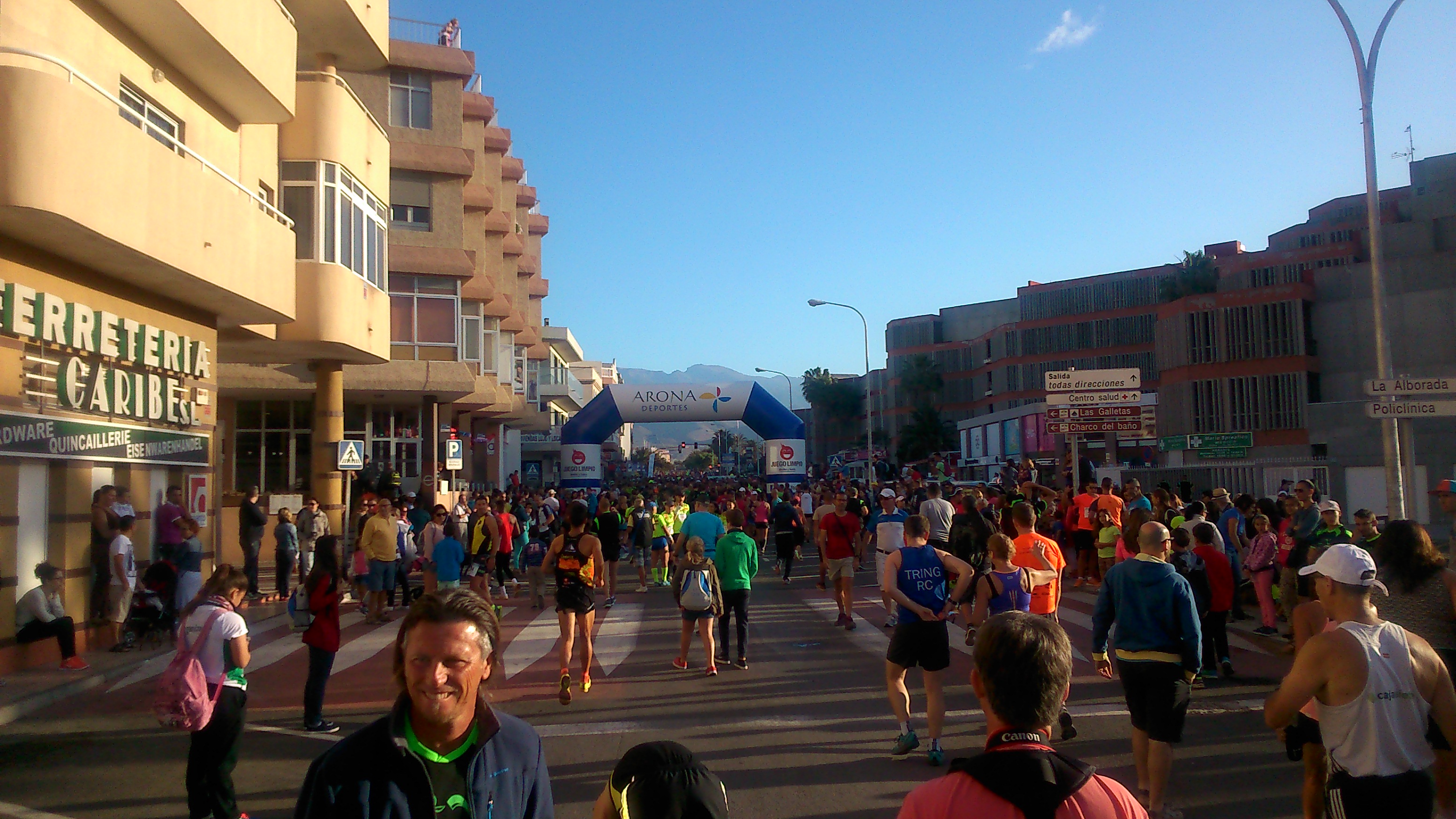 It was a brilliant event. Two laps of a hilly course (typical of Tenerife) along closed roads, water stations every couple of kilometres and lovely weather, if a bit on the warm side for Northern Englanders. I reached the finish line in 1 hour 36, Debbie crossed the line 20 or so minutes later.
