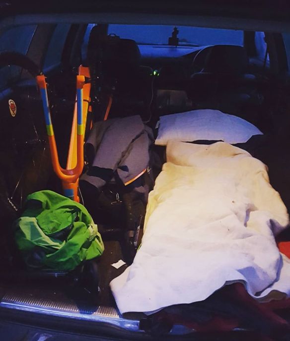 I slept in the Mighty Passat that night, the Stigmata (worth approximately 12 times more than the car) at the other side of the bed. At 5am I got up again, built the bike, drank a nice coffee that Dave had made in his motorhome and headed to the start.